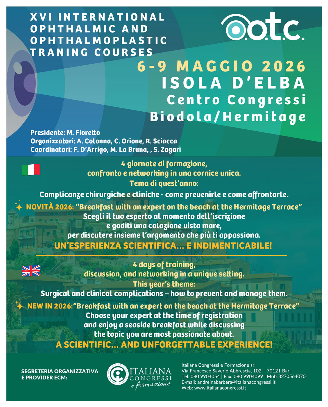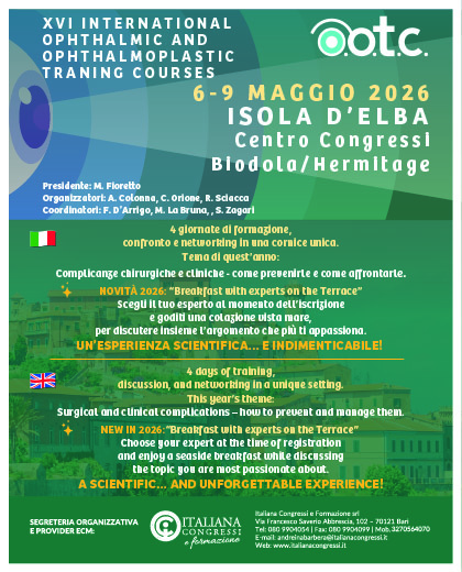 XVI International ophthalmic and ophthalmoplastic training courses Scarica il Programma Download Program 6 - 9 MAGGIO 2026 ISOLA D'ELBA Centro Congressi Biodola/Hermitage ISCRIVITI ORA Completa la tua missione e vinci fantastici premi! Partecipa all'estrazione finale di sabato 24 maggio 2025 SCARICA LA CARTOLINA DEL CONCORSO XV INTERNATIONAL OPHTHALMIC & OPHTHALMOPLASTIC TRAINING COURSES - 2025 GALLERY 2025 COMPLETA Archivio Corsi